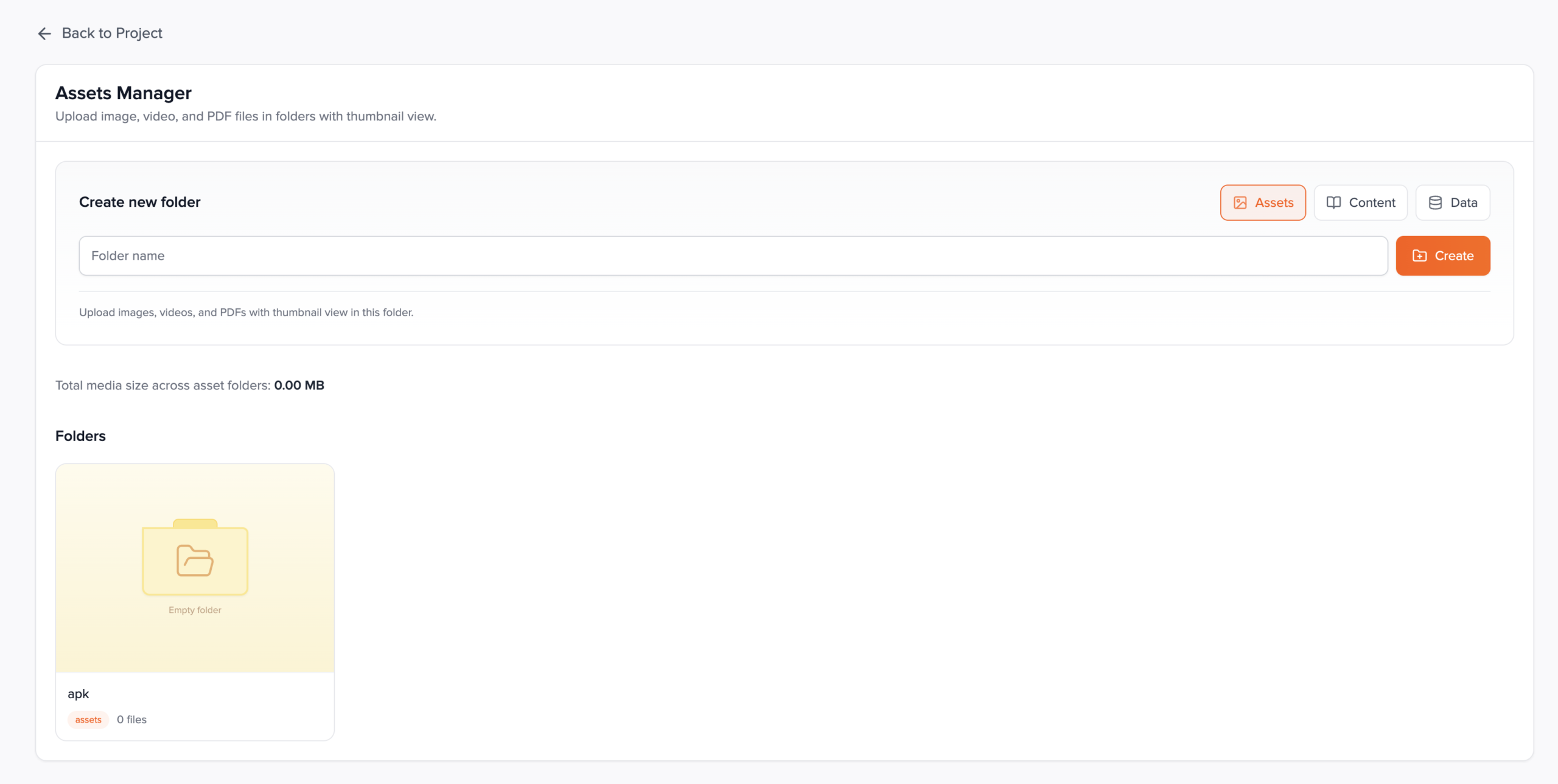 Open Assets Manager from the project services grid. The page has a back to project control, a panel to create new folders, a running total of media size across all assets folders, and a grid of folder cards. Click a card to open that folder’s detail view; from there the UI changes based on folder type.