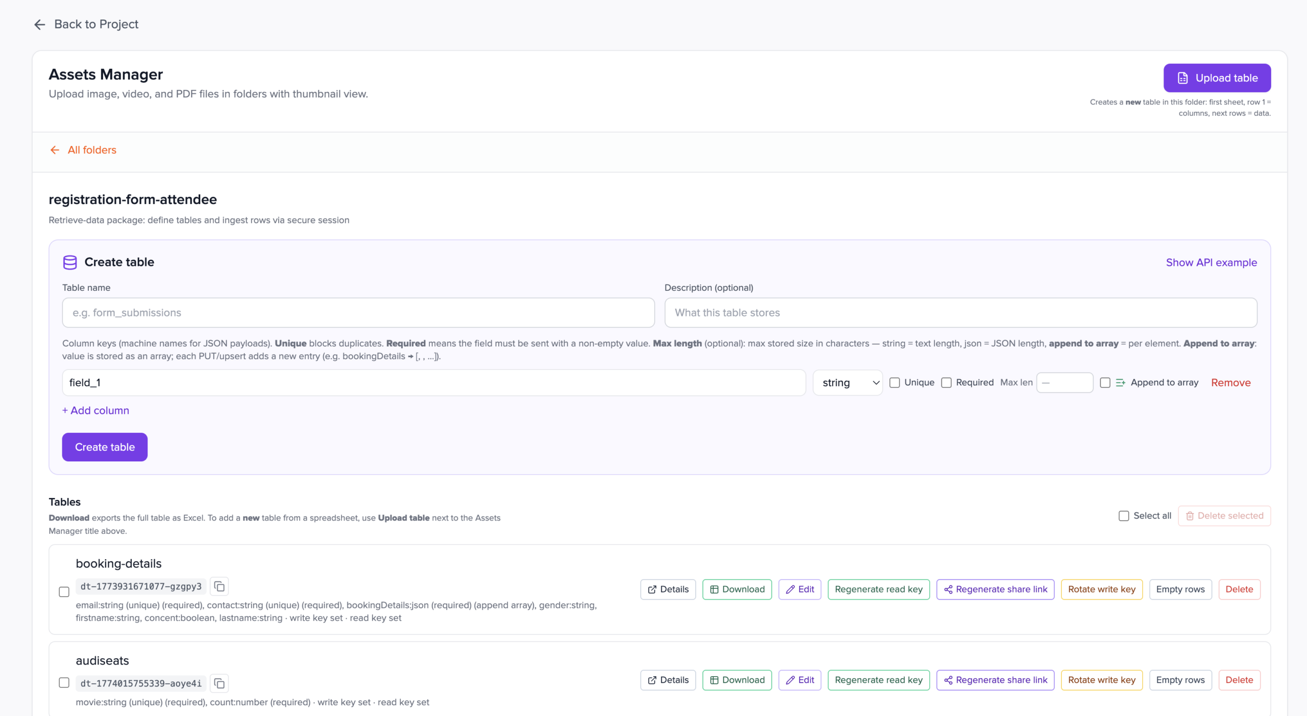 data Retrieve-data: define schemas and ingest rows via session tokens, keys, or dashboard tools. Data tables with column keys (string, number, boolean, json), write/read/share link controls, optional Excel-style import, row browser, and code snippets for session exchange.