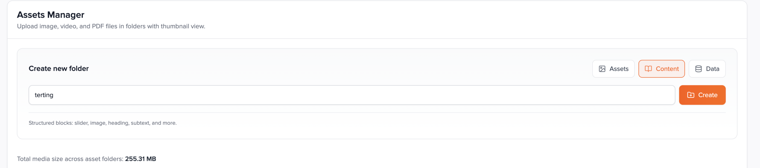 When creating a folder, pick Assets, Content, or Data before entering the name. The helper text under the form summarizes each mode. You cannot mix types inside one folder.