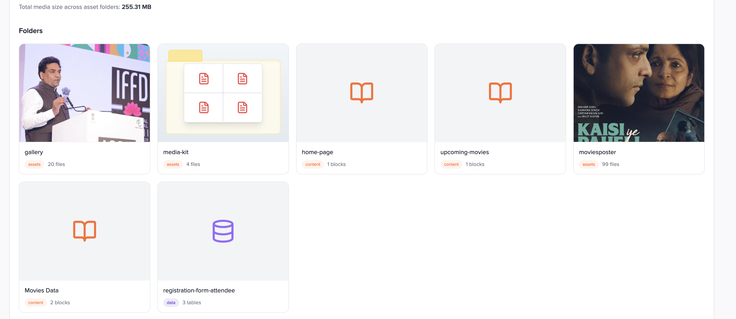 Click a card to navigate into the folder. On hover, use Copy folder ID for API calls (folderId query parameter or request body). Delete folder removes the package from the project; for data folders this also removes associated tables and stored rows as implemented by the API. The dashboard shows Total media size across asset folders so you can monitor storage footprint for binary content only.