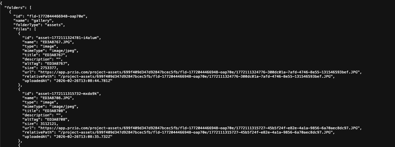 fetch('https://app.przio.com/api/projects/PROJECT_ID/assets?folderId=FOLDER_ID', {
