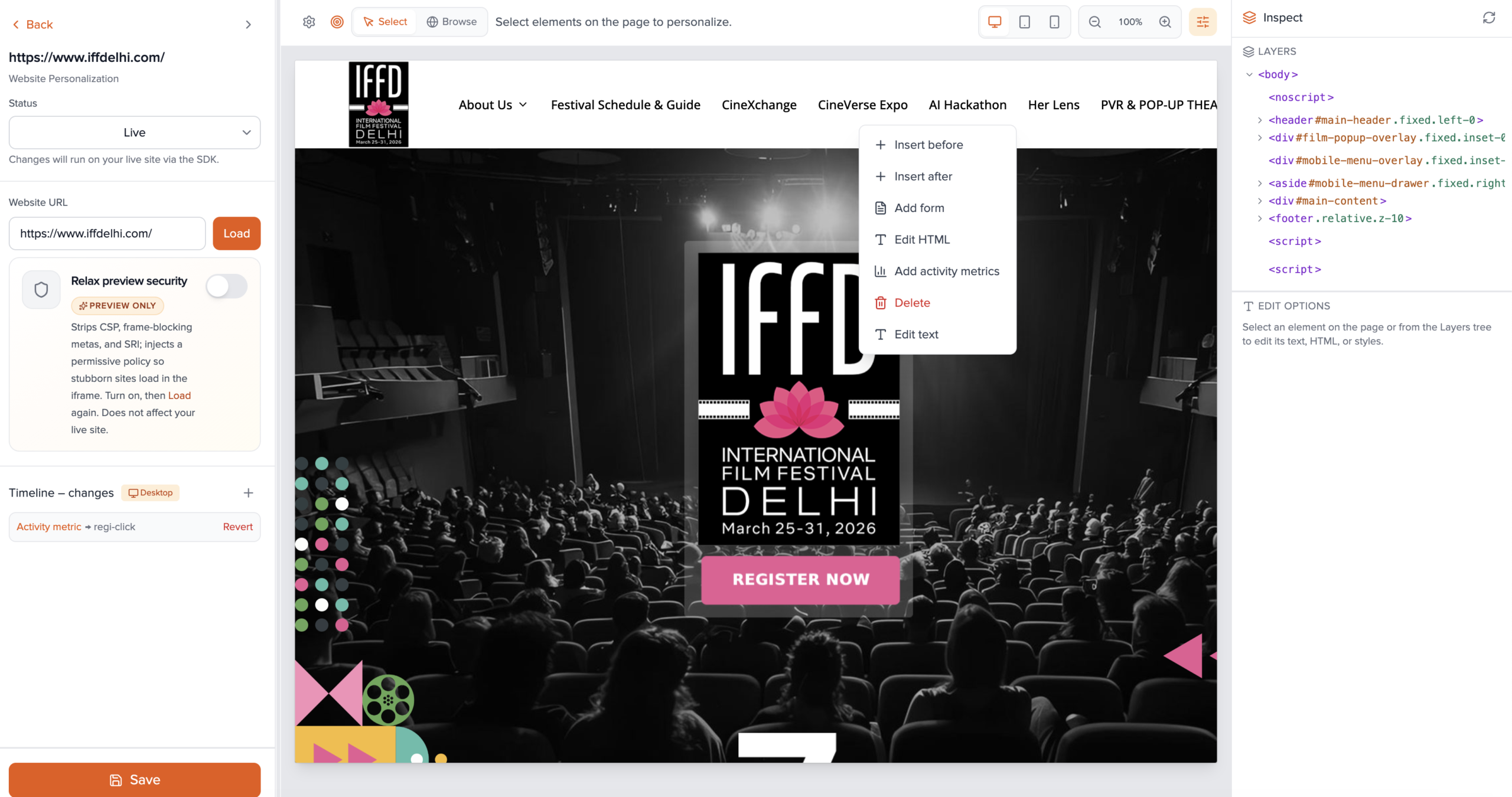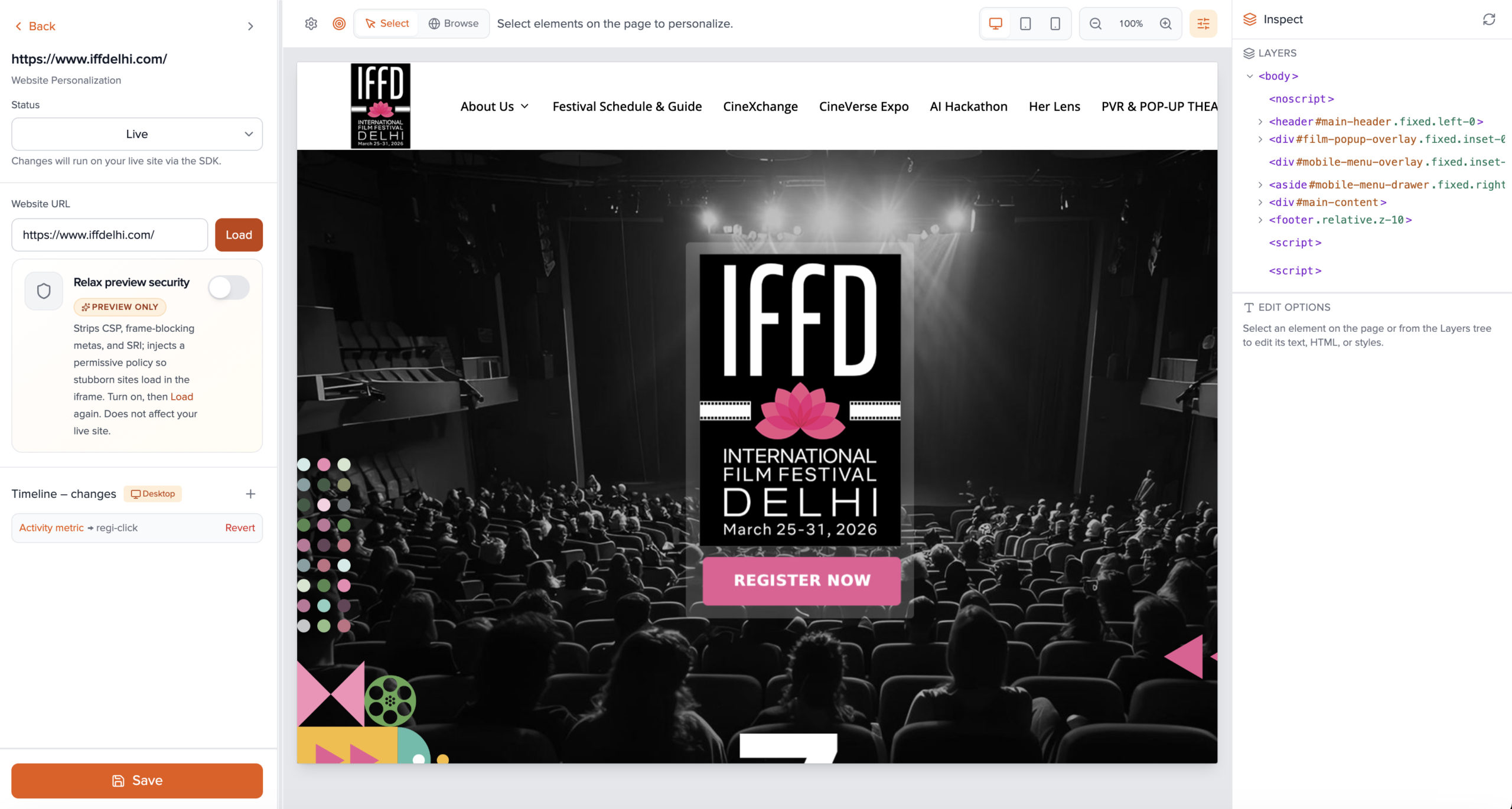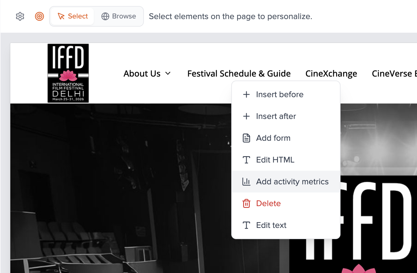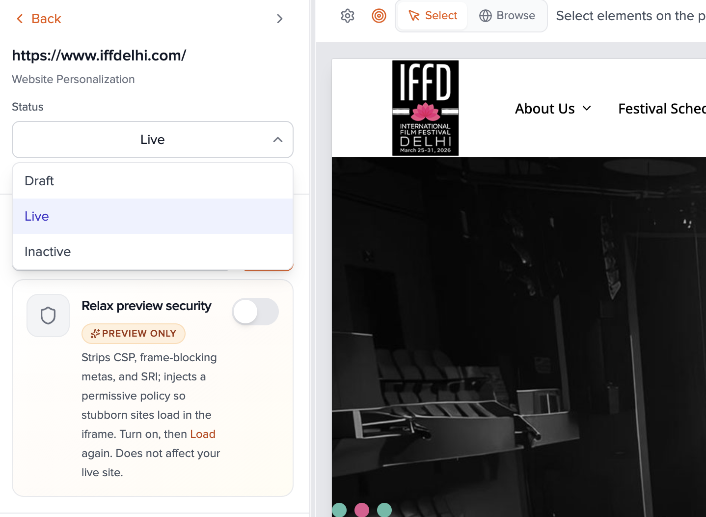 - Use the preview toolbar: Select mode to click elements to personalize; Browse mode to follow links and use the page normally. Switch back to Select to add more edits.