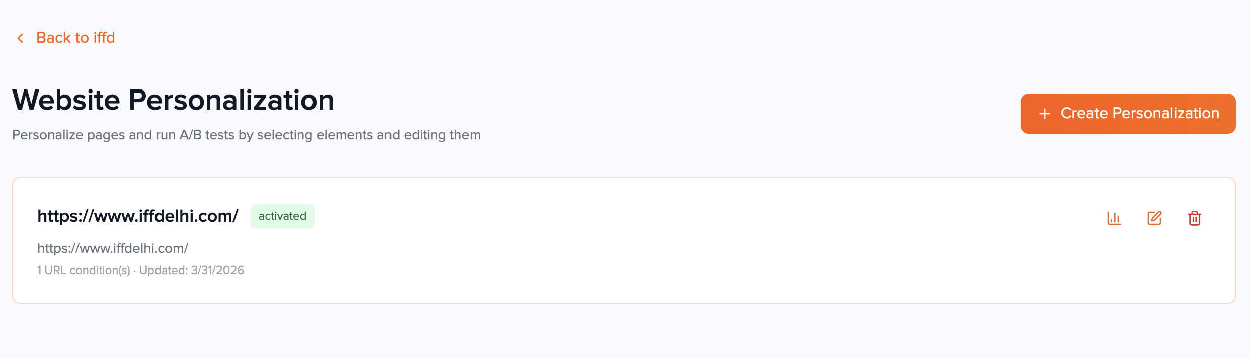 Click Create Personalization in the top-right of the list. If you have no activities yet, the same action appears as Create Your First Personalization in the empty state.