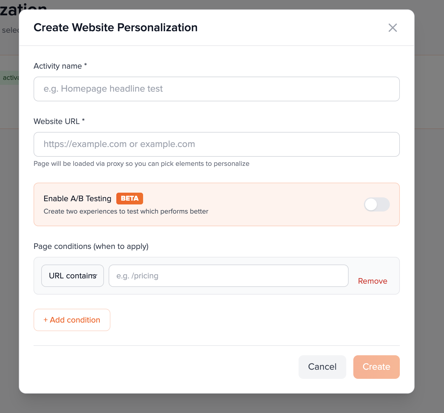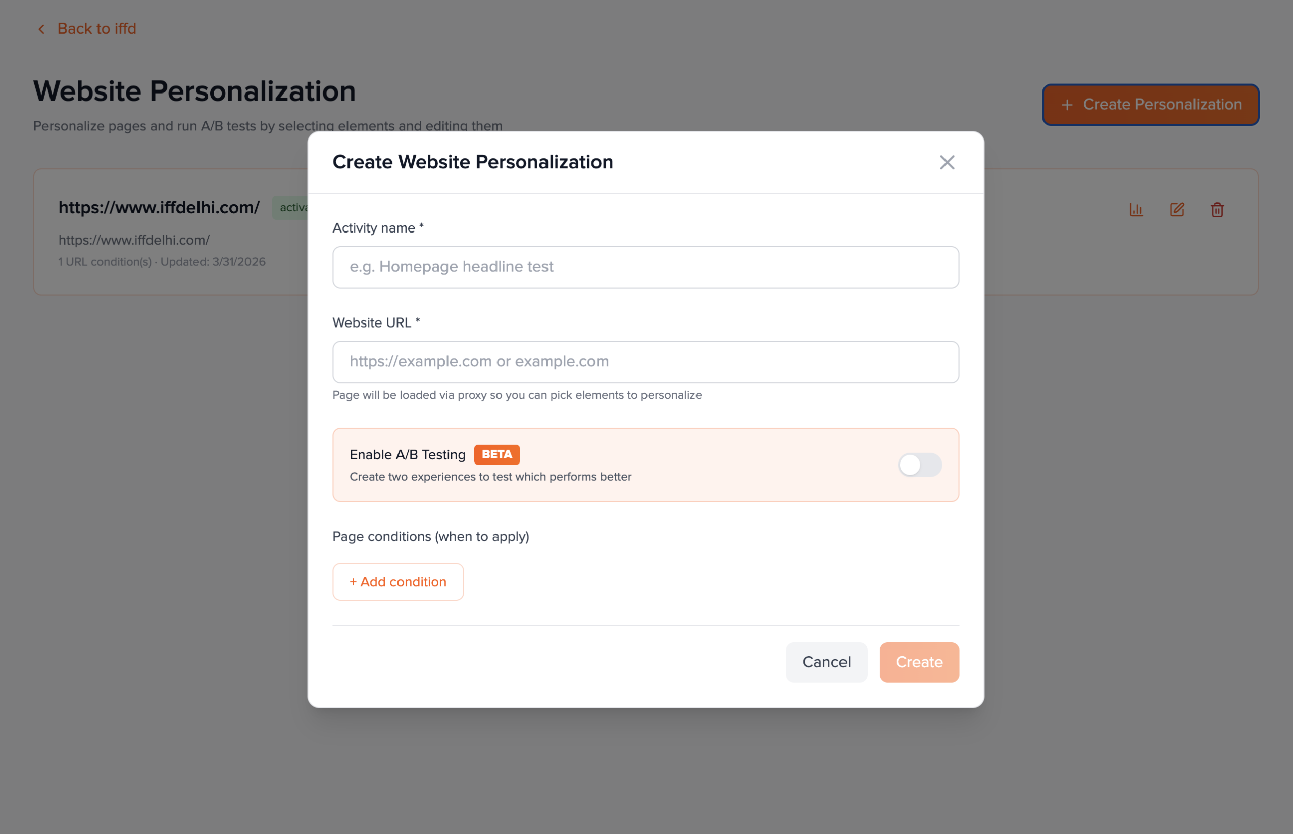 Activities are created from the Website Personalization list for a project. Only Activity name and Website URL are required. URL conditions and A/B are optional in this dialog—you can refine everything later in the editor.