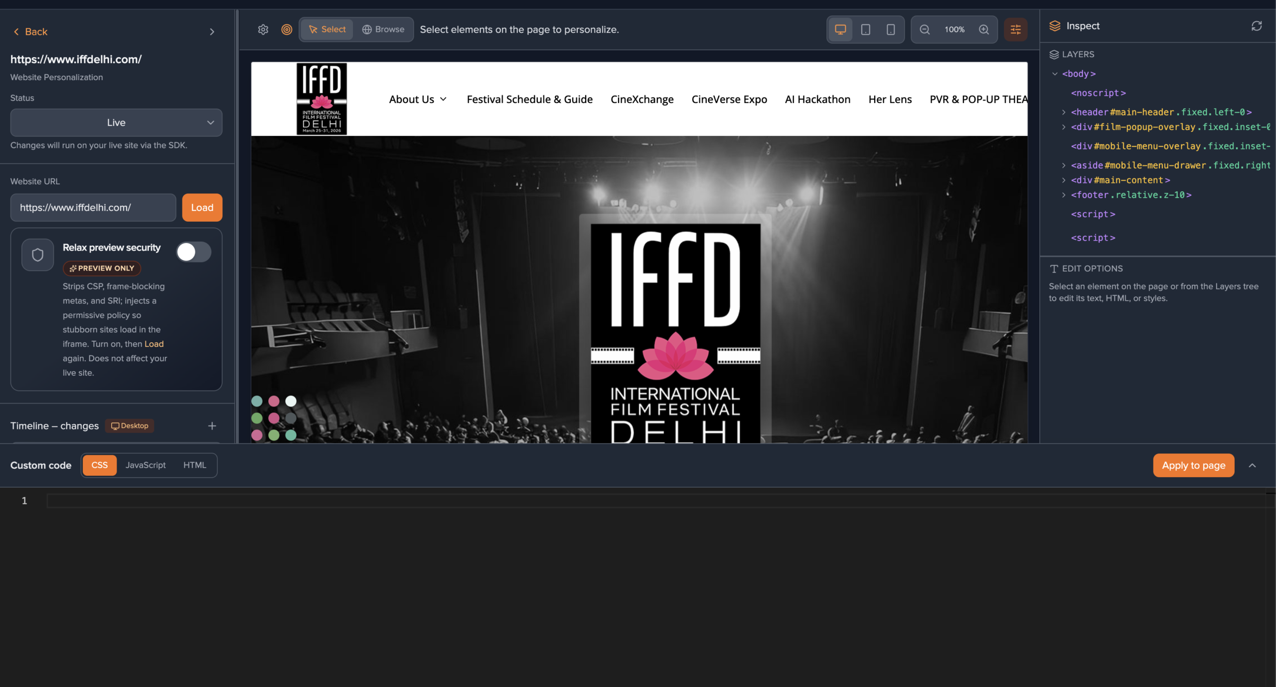 - If loading fails (CSP, frame blocking, etc.), enable Relax preview security in the sidebar—this only affects the editor preview, not your live site—then Load again.