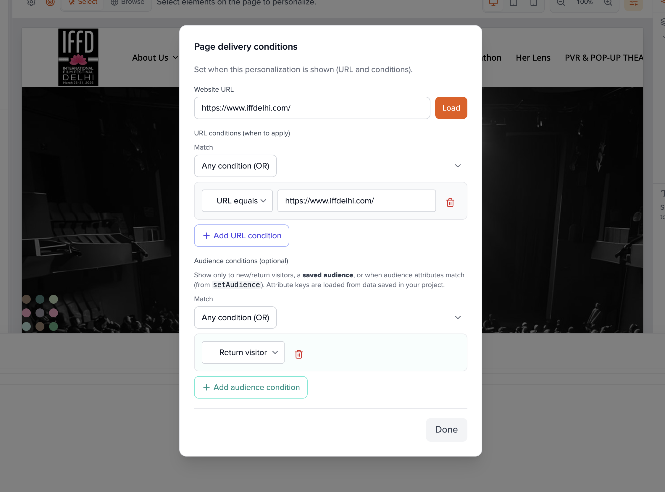 - You can add more conditions later under Page delivery conditions in the editor (gear icon) with the same types.