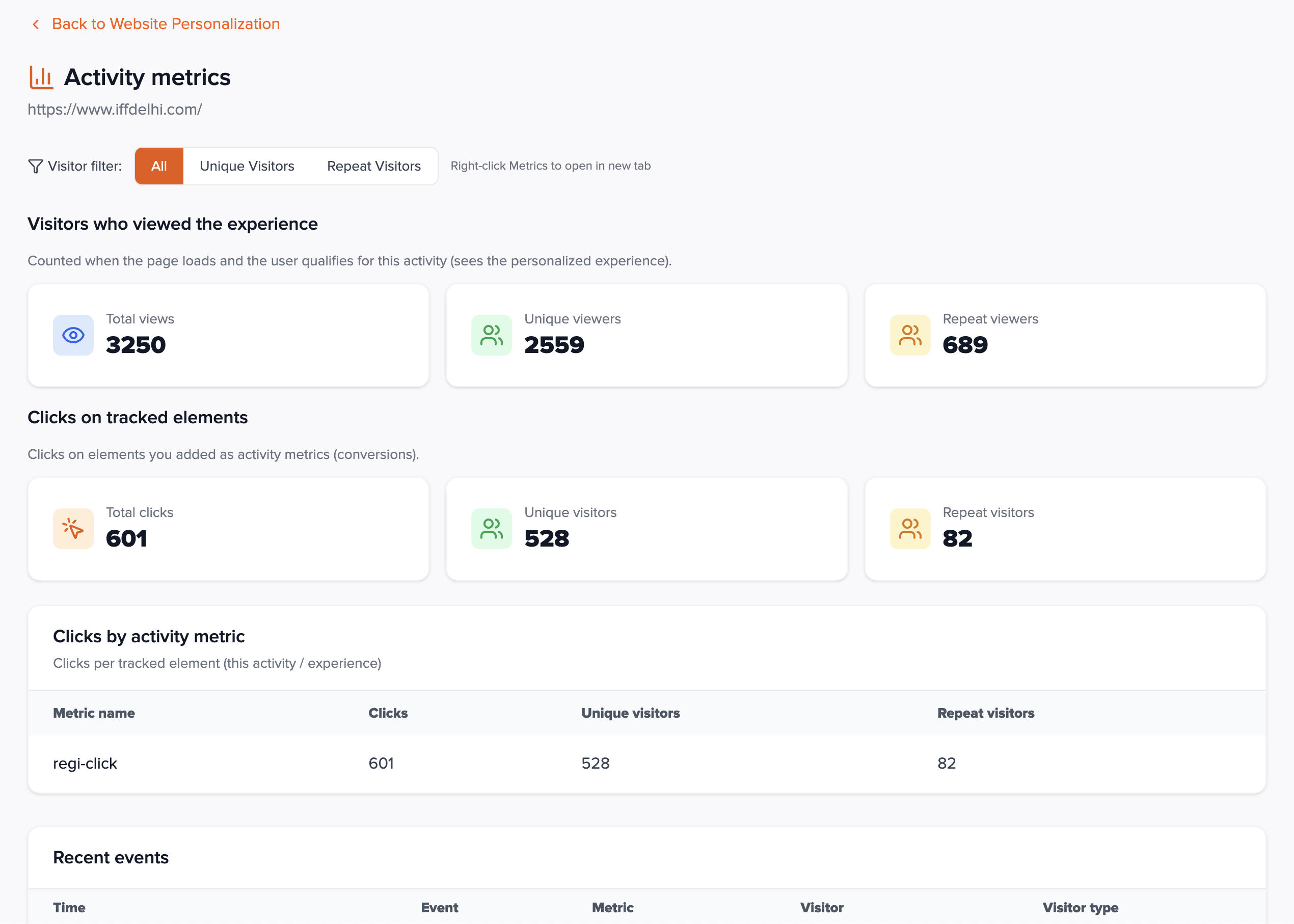 The Activity metrics page rolls up all experiences on the activity (combined views and clicks). Use parallel metric setups per variant and the recent-events list to reason about A/B performance, or separate activities if you need isolated reporting per variant.