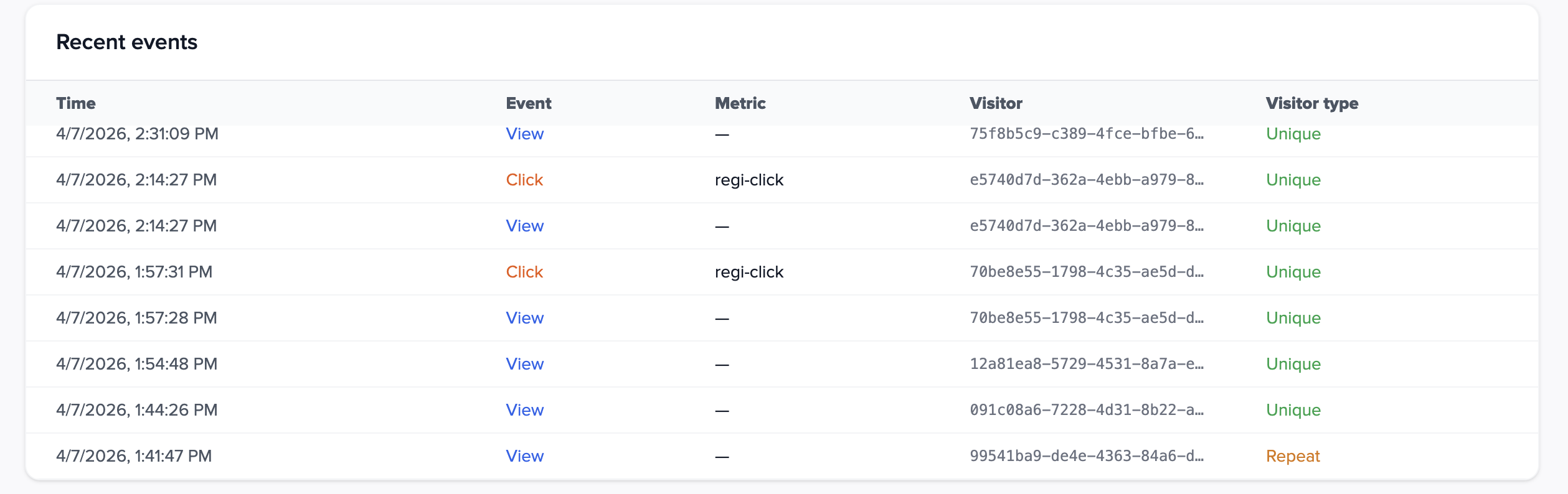 When data exists, a table lists recent rows: time, event type (View or Click), metric name (for clicks), visitor id, and visitor type (Unique vs Repeat). Useful for sanity checks after a deployment.